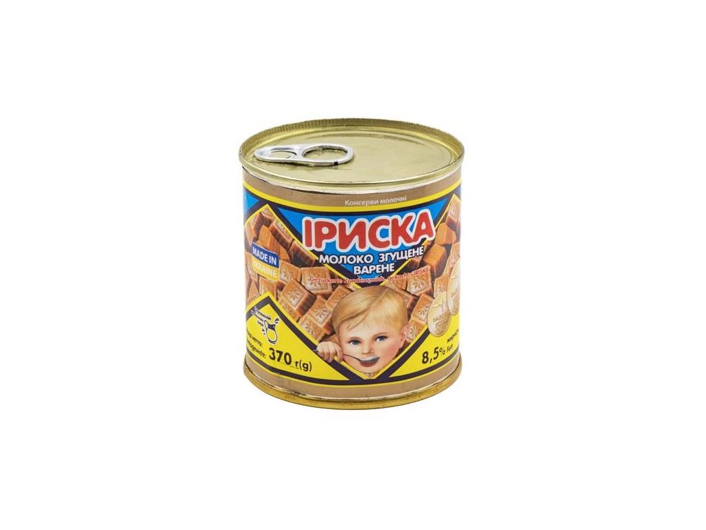 Pervomajsk Slazené kondenzované mléko vařené ´´Iriska´´ 8,5% tuku 370g(1/15kus) Složení: odstředěné kravské mléko, cukr (ne méně než 43,5%), cukr mléčný (laktóza). Čistá hmotnost: 370g. Možná objemová odchylka 3% od čisté hmotnosti produktu. Datum výroby a datum minimální trvanlivosti je uvedeno na dolní části balení. Podmínky skladování: při teplotě od 0 C do 25 C a relativní vlhkosti nejvýše 85%. Doba trvanlivosti: ne více než 12 měsíců od data výroby. Produkt je připravený k spotřebě. Výživové hodnoty na 100g produktu: energetická hmotnost: 1364 kJ/326 kcal, tuky: 8,5g, z nich nasycené: 5,6g, sacharidy: 58g, z nich cukry: 58g, bílkoviny: 7,2g, sůl: 0,32g.1bal = 15 ks