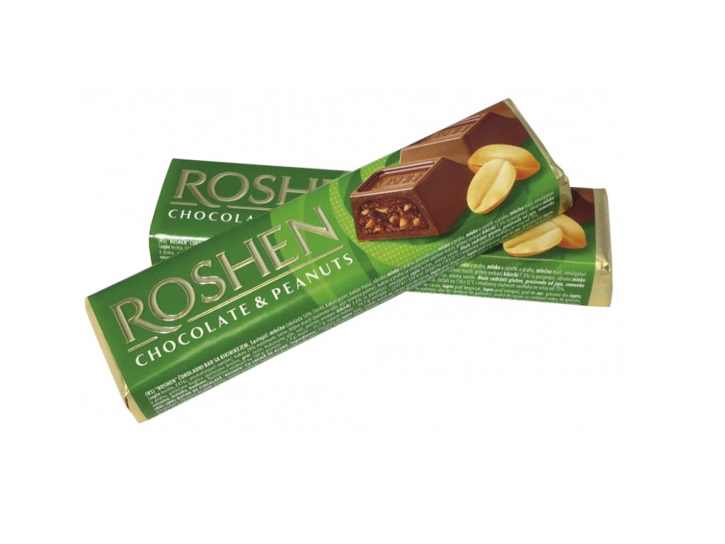 Roshen Čokoládová tyčinka s arašidovou náplní a rýžovými křupinkami 38g. Složení: cukr, rostlinný tuk (nehydrogenovaná palmová jádra, palmový olej), kakaové máslo, sušené odstředěné mléko, kakaové máslo, sušené plnotučné mléko, kakaový prášek se sníženým obsahem tuku, pražená pražená jádra arašídů 3,5 %, sušená mléčná syrovátka, rýžové kuličky 2,8 % (rýžová mouka, krupice (z pšenice), cukr, kukuřičný olej, sůl), pražená a strouhaná jádra arašídů 2,3 %, emulgátory (sójový lecitin E476), mléčný tuk, aroma. Nádivka - 50%. Mléčná čokoláda: minimální obsah kakaových výrobků je 30 %. Může obsahovat lískové ořechy, mandle, sezam, vaječné výrobky. Vyrobeno na Ukrajině. Výživové hodnoty na 100g výrobek: Energetická hodnota 2249 kJ/539 kcal, tuky: 31,9 g, z toho mastné nasycené: 18,2 g, sacharidy: 54 g, z toho cukry: 50,5 g, bílkoviny: 7,2 g, sůl : 0,15 g1bal = 30 ks