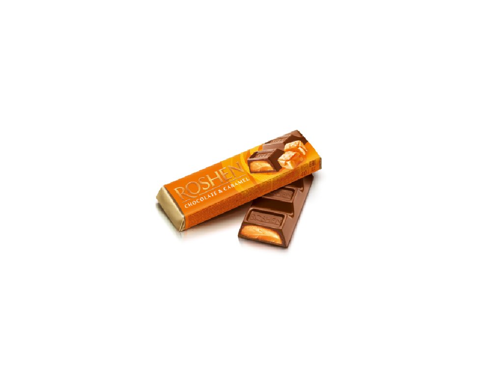 Roshen Čokoládová tyčinka s karamelovou náplní 40g. Složení: cukr, strouhané kakao, glukózo-fruktózový sirup, melasa, kakaové máslo, bambucké máslo, brandy, kakaový prášek se sníženým obsahem tuku, emulgátory (sójový lecitin E476), aroma. Náplň karamel- 43%. Čokoláda: minimální obsah kakaových výrobků je 48%. Kromě kakaového másla obsahuje rostlinné tuky. Může obsahovat lískové ořechy, mandle, sezam, vaječné výrobky, lepek (pšenice). Vyrobeno na Ukrajině. Výživové hodnoty na 100g výrobek: Energetická hodnota 2070 kJ/495 kcal, tuk: 27,3 g, z toho mastné nasycené: 15,6 g, sacharidy: 56,0 g, z toho cukry: 48,7 g, bílkoviny: 5,7 g sol: 0,50 g1bal = 30 ks