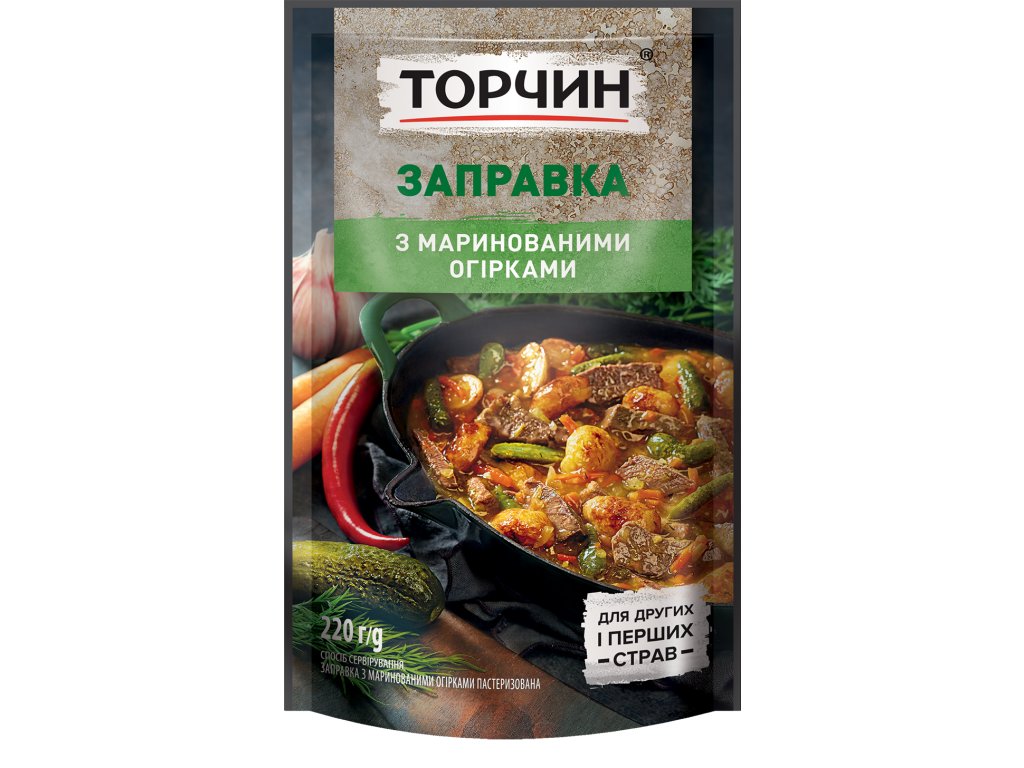 Složení: pitná voda, nakládané okurky, jedlá sůl, cukr, sušené cibule, zahušťovadlo (E-1422), sušená mrkev, slunečnicový olej rafinovaný a dezodorizovaný, regulátor kyselosti (kyselina octová), pastinák kořen, sušený česnek, látka zvýrazňující chuť (Inosinát a guanylát sodný), sušený kopr, přírodní kukuřičná chuť, kurkuma, červený pepř (hořký), extrakt z černého pepře. Může obsahovat stopy mléka, sóji, vajec, hořčice a lepku.